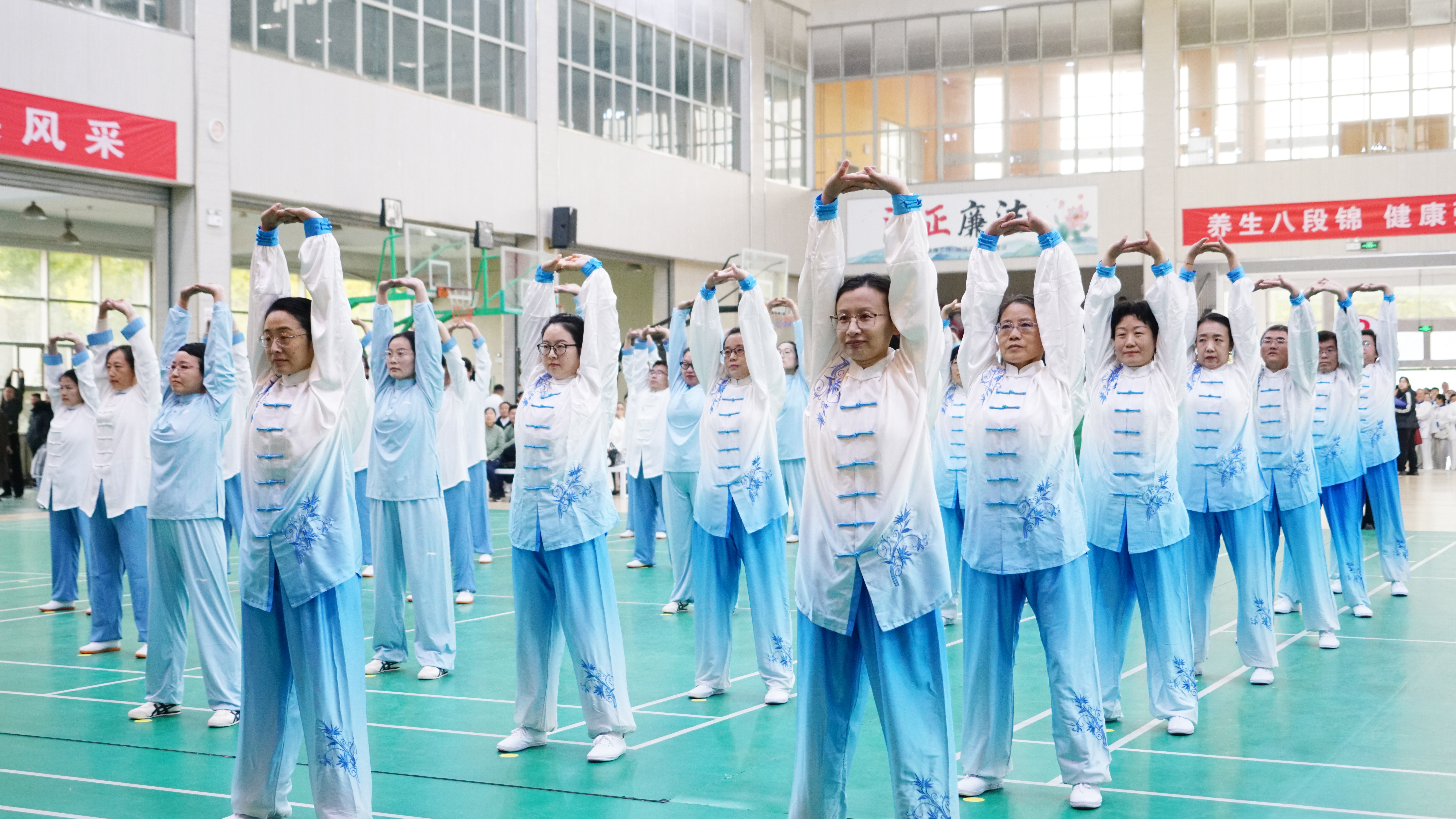 10月25日下午,青岛农业大学在文体馆举办“锦韵飞扬 律动未来”教职工八段锦比赛。校领导田义轲、张玉梅、王峰出席活动并为获奖代表队颁奖。来自全校26个分工会362名教职工参加了比赛。