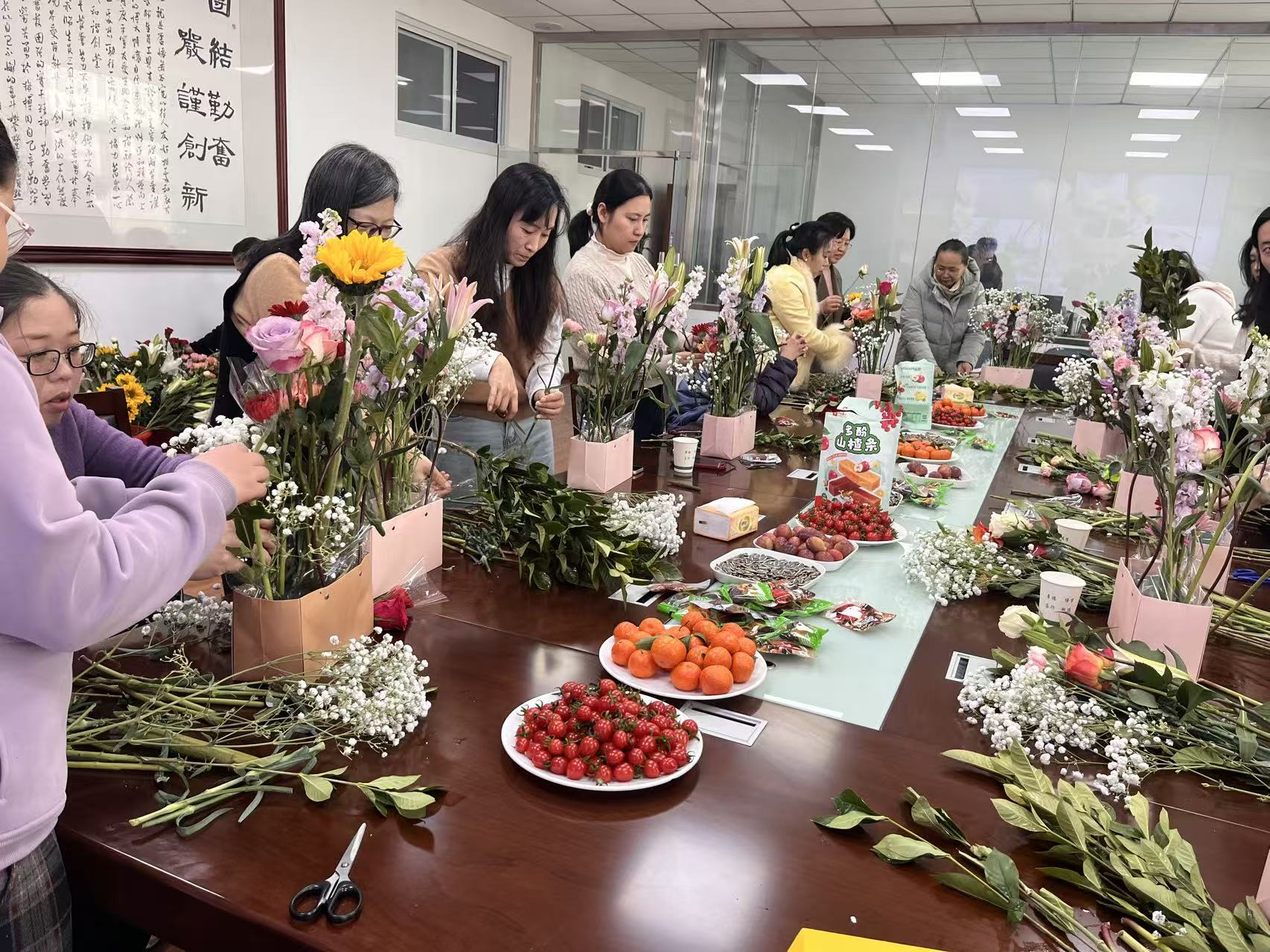 3月8日,为庆祝第116个国际劳动妇女节的到来,提升妇委会女职工团队的凝聚力和向心力。后勤保障处分工会举办了“以花为礼 致敬芳华”主题插花活动,后勤保障处副处长唐召杰和李广臣出席,并代表处领导班子向全处女职工致以节日问候和美好祝福,此次活动得到了全处女职工的热烈反响和积极参与。